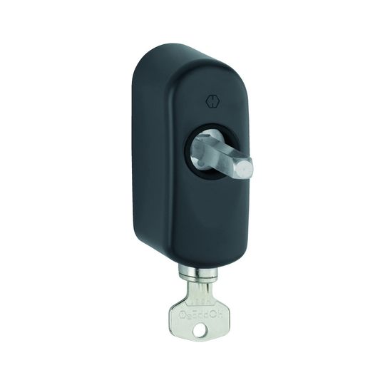 HOPPE Fenstergriffrosette AUS950S 100NM TBT4; Material: Aluminium; Befestigungsart: verdeckt verschraubt; Befestigungstechnik: mit Stütznocken; Funktion: TBT 4,mit automatischer Verriegelung; Einsatzbereich: Drehkipp; Basis: Fenstergriffrosette; Ausführung: abschließbar,mit Drehzylinder; Vierkant: 7 mm; Rastung: 90°; DIN-Richtung: DIN Links-Rechts; Schließfunktion: Wendeschlüssel; Prüfung Abdrehen/Abreißen: 100 N·m; Norm: DIN EN 1627-1630 (RC1-6); Schlüssel Anzahl: 1 St.; Befestigungsabstand: 43 mm; Nockendurchmesser: 10 mm; Fensterwerkstoff: Kunststoff,Holz,Aluminium; Sockelbreite: 34 mm; Sockelhöhe: 84 mm; Sockelstärke: 34 mm; Stift vorstehend: 37 mm; Farbton: schwarz matt; Lieferung: mit Vierkantstift,mit Schrauben; Schraubendurchmesser metrisch: M5; Schraubenlänge metrisch: 50 mm; Zusatzinformation: Besonderheit: integrierte Basis-Sicherheit; Material Unterkonstruktion: Zamak; Technik: Secu100®,SecuTBT®,Secustik®,SecuSelect®