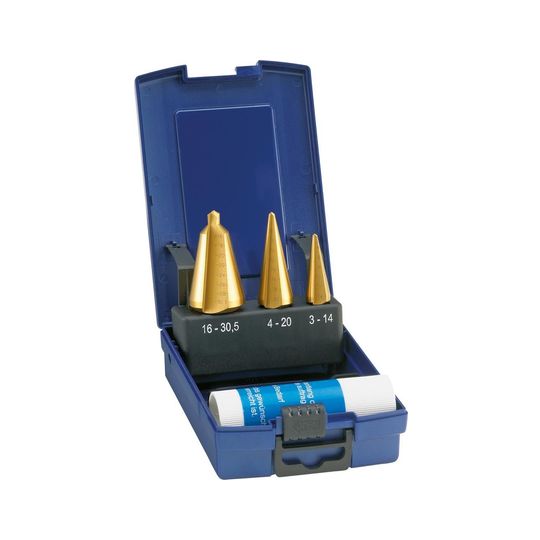 FORUM Präzisions-Blechschälbohrer-Satz (Schälaufbohrer), Oberfläche TiN-beschichtetIn Kunststoffkassette, geordnete und geschützte Aufbewahrung inklusive einer Tube Bohrpaste.Hinweis: Zur Erhöhung der Standzeiten empfehlen wir den Einsatz der Bohrpaste (Bestell-Nr. 66 0500 1051).