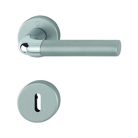 HOPPE Drückergarnitur Bremen 1505/42KV/42KVS; Produkttyp: Drückergarnitur; Produkttyp (Hersteller): Drückergarnitur; Ausführung: Rosette; Befestigungsart Drückerrosette (außen): verdeckt verschraubt; Befestigungsart Drückerrosette (innen): verdeckt verschraubt; Befestigungsart Schlüsselrosette (außen): verdeckt verschraubt; Befestigungsart Schlüsselrosette (innen): verdeckt verschraubt; Befestigungstechnik: mit Stütznocken; Form Drückerrosette: rund; Form Schlüsselrosette (außen): rund; Form Schlüsselrosette (innen): rund; Vierkant: 8 mm; Material: Aluminium; Form Türgriff (innen): L-Form; Form Türgriff (außen): L-Form; Durchmesser Türgriff (innen): 20; Durchmesser Türgriff (außen): 20; Durchmesser Schlüsselrosette: 52 mm; Länge Türgriff (innen): 132; Länge Türgriff (außen): 132; Höhe Türgriff (innen): 54; Höhe Türgriff (außen): 54; Durchmesser Drückerrosette (außen): 52 mm; Durchmesser Drückerrosette (innen): 52 mm; Höhe Drückerrosette (außen): 9 mm; Höhe Drückerrosette (innen): 9 mm; Höhe Schlüsselrosette (außen): 9 mm; Höhe Schlüsselrosette (innen): 9 mm; Lagerung: wartungsfreies Gleitlager,mit Rückholfeder; Einsatzbereich: Objekttür; Türart: Vollblatt; Türwerkstoff: Holz,Stahl; Lochung: Buntbart gelocht; DIN-Richtung: DIN Links-Rechts; Farbe: mehrfarbig; Farbton: verchromt/Stahl matt; Oberfläche: eloxiert; Ausführung Vierkant: Vierkantstift; Türstärke min.: 37 mm; Türstärke max.: 42 mm; Norm: DIN EN 1906