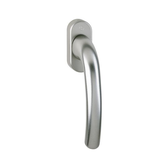 HOPPE Fenstergriff Tôkyô 0710/U26; Material: Aluminium; Vierkant: 7 mm; Befestigungsart: verdeckt verschraubt; Befestigungstechnik: mit Stütznocken; Lieferung: ohne Schrauben,mit Vierkantstift; Basis: Fenstergriff; Oberfläche: eloxiert; Farbton: stahlfarbig; Stift vorstehend: 35 mm; Rastung: 90°; Funktion: mit selbsttätiger Verriegelung; DIN-Richtung: DIN Links-Rechts; Einsatzbereich: Drehkipp; Anwendung: für nach innen öffnende Fenster und Fenstertüren; Griffform: gebogen; Grifflänge: 128 mm; Griffhöhe: 49 mm; Sockelausführung: mit ovaler Rosette; Sockelbreite: 29 mm; Sockelhöhe: 66 mm; Sockelstärke: 13 mm; Befestigungsabstand: 43 mm; Nockendurchmesser: 10 mm; Material Unterkonstruktion: Kunststoff; Norm: DIN EN 13126-3; Prüfung: RAL-GZ 607/9; Fensterwerkstoff: Kunststoff,Holz,Aluminium; Aufdruck: mit Logo