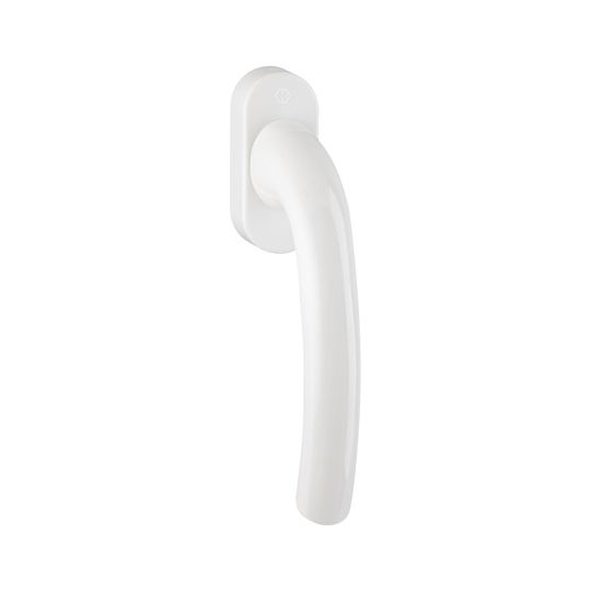 HOPPE Fenstergriff Tôkyô 0710/U26; Material: Aluminium; Vierkant: 7 mm; Befestigungsart: verdeckt verschraubt; Befestigungstechnik: mit Stütznocken; Lieferung: ohne Schrauben,mit Vierkantstift; Basis: Fenstergriff; Oberfläche: beschichtet; Farbton: verkehrsweiß; Stift vorstehend: 35 mm; Rastung: 90°; Funktion: mit selbsttätiger Verriegelung; DIN-Richtung: DIN Links-Rechts; Einsatzbereich: Drehkipp; Anwendung: für nach innen öffnende Fenster und Fenstertüren; Griffform: gebogen; Grifflänge: 128 mm; Griffhöhe: 49 mm; Sockelausführung: mit ovaler Rosette; Sockelbreite: 29 mm; Sockelhöhe: 66 mm; Sockelstärke: 13 mm; Befestigungsabstand: 43 mm; Nockendurchmesser: 10 mm; Material Unterkonstruktion: Kunststoff; Norm: DIN EN 13126-3; Prüfung: RAL-GZ 607/9; Fensterwerkstoff: Aluminium,Holz,Kunststoff; Aufdruck: mit Logo
