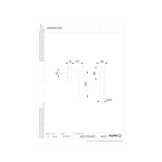 HOPPE Fenstergriff Amsterdam E0400/U30; Material: Edelstahl; Vierkant: 7 mm; Befestigungsart: verdeckt verschraubt; Befestigungstechnik: mit Stütznocken; Lieferung: mit Schrauben; Basis: Fenstergriff; Farbton: edelstahl matt; Stift vorstehend: 43 mm; Rastung: 90°; Funktion: mit selbsttätiger Verriegelung; DIN-Richtung: DIN Links-Rechts; Einsatzbereich: Drehkipp; Anwendung: für nach innen öffnende Fenster und Fenstertüren; Griffform: Gehrung; Griffdurchmesser: 20 mm; Grifflänge: 125 mm; Griffhöhe: 57 mm; Sockelausführung: mit ovaler Rosette; Sockelbreite: 29 mm; Sockelhöhe: 68 mm; Sockelstärke: 15 mm; Befestigungsabstand: 43 mm; Nockendurchmesser: 10 mm; Material Unterkonstruktion: Kunststoff; Fensterwerkstoff: Holz,Aluminium,Kunststoff; Aufdruck: mit Logo