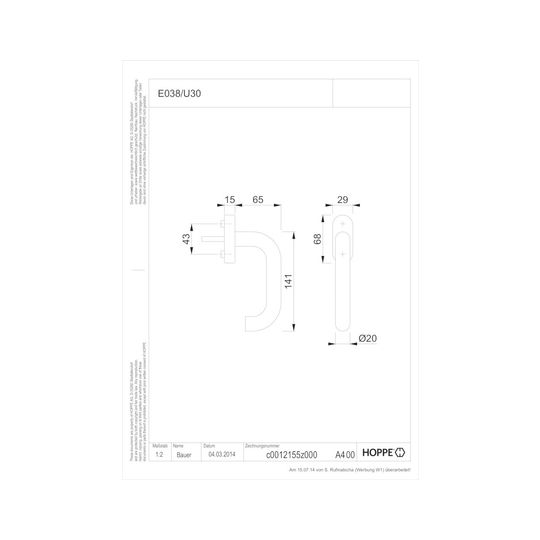 HOPPE Fenstergriff Paris E038/U30; Material: Edelstahl; Vierkant: 7 mm; Befestigungsart: verdeckt verschraubt; Befestigungstechnik: mit Stütznocken; Lieferung: mit Schrauben; Basis: Fenstergriff; Farbton: edelstahl matt; Stift vorstehend: 43 mm; Rastung: 90°; Funktion: mit selbsttätiger Verriegelung; DIN-Richtung: DIN Links-Rechts; Einsatzbereich: Drehkipp; Anwendung: für nach innen öffnende Fenster und Fenstertüren; Griffform: U-Form; Griffdurchmesser: 20 mm; Grifflänge: 141 mm; Griffhöhe: 66 mm; Sockelausführung: mit ovaler Rosette; Sockelbreite: 29 mm; Sockelhöhe: 68 mm; Sockelstärke: 14 mm; Befestigungsabstand: 43 mm; Nockendurchmesser: 10 mm; Material Unterkonstruktion: Kunststoff; Fensterwerkstoff: Holz,Aluminium,Kunststoff; Aufdruck: mit Logo; Modellnummer: E038/U30