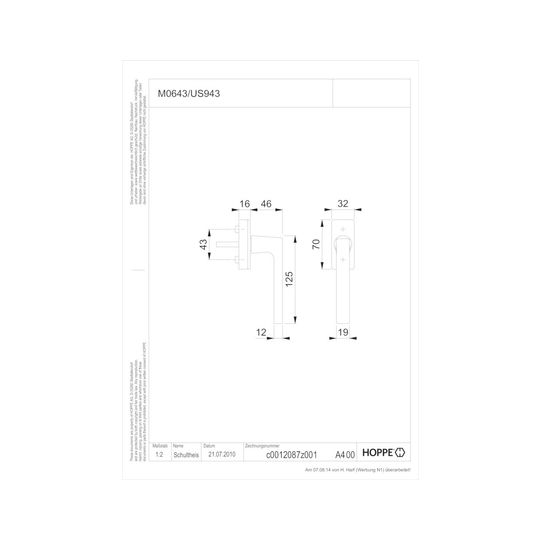 HOPPE Fenstergriff Dallas M0643/US943; Material: Messing; Vierkant: 7 mm; Befestigungsart: verdeckt verschraubt; Befestigungstechnik: mit Stütznocken; Lieferung: mit Schrauben,mit Vierkantstift; Basis: Fenstergriff; Ausführung: VarioFit®; Farbton: satiniert verchromt-Resista; Stift vorstehend: 32-42 mm; Rastung: 90°; Funktion: mit selbsttätiger Verriegelung; Technik: Secustik®; DIN-Richtung: DIN Links-Rechts; Einsatzbereich: Drehkipp; Anwendung: für nach innen öffnende Fenster und Fenstertüren; Griffform: L-Form; Grifflänge: 125 mm; Griffbreite: 19 mm; Griffhöhe: 46 mm; Sockelausführung: mit eckiger Rosette; Sockelbreite: 32 mm; Sockelhöhe: 70 mm; Sockelstärke: 16 mm; Befestigungsabstand: 43 mm; Nockendurchmesser: 10 mm; Material Unterkonstruktion: Kunststoff,mit Messingrahmen; Fensterwerkstoff: Aluminium,Holz,Kunststoff; Aufdruck: mit Logo; Zusatzinformation: integrierte Basis-Sicherheit