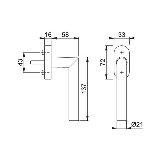 HOPPE Fenstergriff Amsterdam 0400/US956; Material: Aluminium; Vierkant: 7 mm; Befestigungsart: verdeckt verschraubt; Befestigungstechnik: mit Stütznocken; Lieferung: mit Schrauben,mit Vierkantstift; Basis: Fenstergriff; Ausführung: VarioFit®; Oberfläche: eloxiert; Farbton: natur matt-SecuSan; Stift vorstehend: 20-30 mm; Rastung: 90°; Funktion: mit selbsttätiger Verriegelung; Technik: Secustik®; DIN-Richtung: DIN Links-Rechts; Einsatzbereich: Drehkipp; Anwendung: für nach innen öffnende Fenster und Fenstertüren; Griffform: Gehrung; Grifflänge: 137 mm; Griffbreite: 21 mm; Griffhöhe: 58 mm; Sockelausführung: mit ovaler Rosette; Sockelbreite: 33 mm; Sockelhöhe: 72 mm; Sockelstärke: 16 mm; Befestigungsabstand: 43 mm; Nockendurchmesser: 10 mm; Material Unterkonstruktion: Kunststoff; Norm: DIN EN 13126-3; Prüfung: RAL-GZ 607/9; Fensterwerkstoff: Holz,Aluminium,Kunststoff; Aufdruck: mit Logo; Zusatzinformation: integrierte Basis-Sicherheit