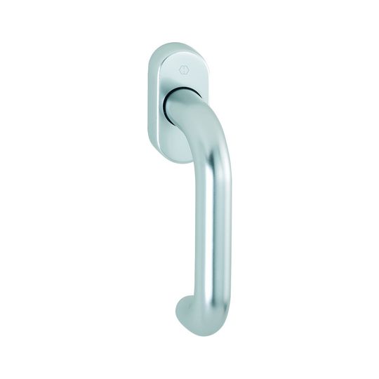 HOPPE Fenstergriff Paris 038/US956; Material: Aluminium; Vierkant: 7 mm; Befestigungsart: verdeckt verschraubt; Befestigungstechnik: mit Stütznocken; Lieferung: mit Schrauben,mit Vierkantstift; Basis: Fenstergriff; Ausführung: VarioFit®; Oberfläche: eloxiert; Farbton: naturfarbig; Stift vorstehend: 20-30 mm; Rastung: 90°; Funktion: mit selbsttätiger Verriegelung; Technik: Secustik®; DIN-Richtung: DIN Links-Rechts; Einsatzbereich: Drehkipp; Anwendung: für nach innen öffnende Fenster und Fenstertüren; Griffform: U-Form; Grifflänge: 143 mm; Griffbreite: 20 mm; Griffhöhe: 59 mm; Sockelausführung: mit ovaler Rosette; Sockelbreite: 33 mm; Sockelhöhe: 72 mm; Sockelstärke: 16 mm; Befestigungsabstand: 43 mm; Nockendurchmesser: 10 mm; Material Unterkonstruktion: Kunststoff; Norm: DIN EN 13126-3; Prüfung: RAL-GZ 607/9; Fensterwerkstoff: Holz,Aluminium,Kunststoff; Aufdruck: mit Logo; Zusatzinformation: integrierte Basis-Sicherheit