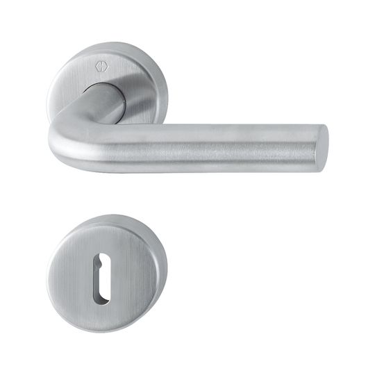 HOPPE Drückergarnitur Bonn E150/42H/42HKVS; Produkttyp: Drückergarnitur; Produkttyp (Hersteller): Drückergarnitur; Ausführung: Rosette; Befestigungsart Drückerrosette (außen): verdeckt verschraubt; Befestigungsart Drückerrosette (innen): verdeckt verschraubt; Befestigungsart Schlüsselrosette (außen): verdeckt verschraubt; Befestigungsart Schlüsselrosette (innen): verdeckt verschraubt; Befestigungstechnik: mit Stütznocken; Form Drückerrosette: rund; Form Schlüsselrosette (außen): rund; Form Schlüsselrosette (innen): rund; Vierkant: 8 mm; Material: Edelstahl; Material Unterkonstruktion (Griffrosette): Stahl; Form Türgriff (innen): L-Form; Form Türgriff (außen): L-Form; Durchmesser Türgriff (innen): 20; Durchmesser Türgriff (außen): 20; Durchmesser Schlüsselrosette: 52 mm; Länge Türgriff (innen): 130; Länge Türgriff (außen): 130; Höhe Türgriff (innen): 66; Höhe Türgriff (außen): 66; Durchmesser Drückerrosette (außen): 52 mm; Durchmesser Drückerrosette (innen): 52 mm; Höhe Drückerrosette (außen): 10 mm; Höhe Drückerrosette (innen): 10 mm; Höhe Schlüsselrosette (außen): 10 mm; Höhe Schlüsselrosette (innen): 10 mm; Lagerung: wartungsfreies Gleitlager,mit Rückholfeder,festdrehbar; Einsatzbereich: Objekttür; Türart: Vollblatt; Türwerkstoff: Holz,Stahl; Lochung: Buntbart gelocht; DIN-Richtung: DIN Links-Rechts; Farbe: grau; Farbton: edelstahl matt; Material Unterkonstruktion (Schlüsselrosette): Kunststoff; Ausführung Vierkant: Profilvollstift; Türstärke min.: 40 mm; Türstärke max.: 45 mm; Norm: DIN EN 1906