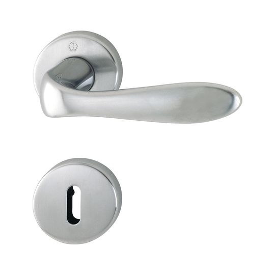 HOPPE Drückergarnitur Genova M1535/19KV/19KVS; Produkttyp: Drückergarnitur; Produkttyp (Hersteller): Drückergarnitur; Ausführung: Rosette; Befestigungsart Drückerrosette (außen): verdeckt verschraubt; Befestigungsart Drückerrosette (innen): verdeckt verschraubt; Befestigungsart Schlüsselrosette (außen): verdeckt verschraubt; Befestigungsart Schlüsselrosette (innen): verdeckt verschraubt; Befestigungstechnik: mit Stütznocken; Form Drückerrosette: rund; Form Schlüsselrosette (außen): rund; Form Schlüsselrosette (innen): rund; Vierkant: 8 mm; Material: Messing; Form Türgriff (innen): Design; Form Türgriff (außen): Design; Durchmesser Schlüsselrosette: 52 mm; Länge Türgriff (innen): 125; Länge Türgriff (außen): 125; Höhe Türgriff (innen): 56; Höhe Türgriff (außen): 56; Durchmesser Drückerrosette (außen): 52 mm; Durchmesser Drückerrosette (innen): 52 mm; Höhe Drückerrosette (außen): 11 mm; Höhe Drückerrosette (innen): 11 mm; Höhe Schlüsselrosette (außen): 11 mm; Höhe Schlüsselrosette (innen): 11 mm; Lagerung: wartungsfreies Gleitlager,mit Rückholfeder; Einsatzbereich: Objekttür; Türart: Vollblatt; Türwerkstoff: Holz,Stahl; Lochung: Buntbart gelocht; DIN-Richtung: DIN Links-Rechts; Farbe: silber; Farbton: satiniert verchromt/verchromt-Resista; Ausführung Vierkant: Vierkantstift; Türstärke min.: 37 mm; Türstärke max.: 42 mm; Norm: DIN EN 1906