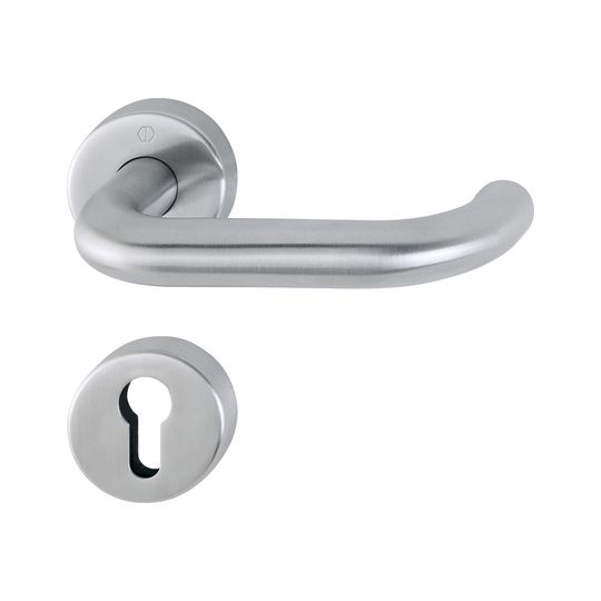 HOPPE Drückergarnitur Paris E138/42H/42HKVS; Produkttyp: Drückergarnitur; Produkttyp (Hersteller): Drückergarnitur; Ausführung: Rosette; Befestigungsart Drückerrosette (außen): verdeckt verschraubt; Befestigungsart Drückerrosette (innen): verdeckt verschraubt; Befestigungsart Schlüsselrosette (außen): verdeckt verschraubt; Befestigungsart Schlüsselrosette (innen): verdeckt verschraubt; Befestigungstechnik: mit Stütznocken; Form Drückerrosette: rund; Form Schlüsselrosette (außen): rund; Form Schlüsselrosette (innen): rund; Vierkant: 8 mm; Material: Edelstahl; Form Türgriff (innen): U-Form; Form Türgriff (außen): U-Form; Durchmesser Türgriff (innen): 20; Durchmesser Türgriff (außen): 20; Durchmesser Schlüsselrosette: 52 mm; Länge Türgriff (innen): 141; Länge Türgriff (außen): 141; Höhe Türgriff (innen): 66; Höhe Türgriff (außen): 66; Durchmesser Drückerrosette (außen): 52 mm; Durchmesser Drückerrosette (innen): 52 mm; Höhe Drückerrosette (außen): 10 mm; Höhe Drückerrosette (innen): 10 mm; Höhe Schlüsselrosette (außen): 10 mm; Höhe Schlüsselrosette (innen): 10 mm; Lagerung: wartungsfreies Gleitlager,mit Rückholfeder,festdrehbar; Einsatzbereich: Objekttür; Türart: Vollblatt; Türwerkstoff: Holz,Stahl; Lochung: Profilzylinder gelocht; DIN-Richtung: DIN Links-Rechts; Farbe: grau; Farbton: edelstahl matt; Material Unterkonstruktion (Schlüsselrosette): Kunststoff; Ausführung Vierkant: Profilvollstift; Türstärke min.: 40 mm; Türstärke max.: 45 mm; Norm: DIN EN 1906