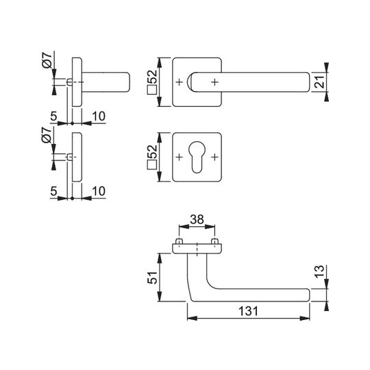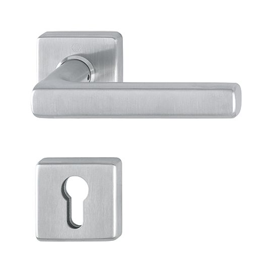 HOPPE Halbgarnitur Dallas E1643Z/52/52S; Produkttyp: Halbgarnitur; Produkttyp (Hersteller): Halbgarnitur; Ausführung: Rosette; Befestigungsart Drückerrosette (innen): verdeckt verschraubt; Befestigungsart Schlüsselrosette (innen): verdeckt verschraubt; Befestigungstechnik: mit Stütznocken; Form Drückerrosette: eckig; Form Schlüsselrosette (innen): eckig; Vierkant: 8 mm; Material: Edelstahl; Form Türgriff (innen): L-Form; Breite Türgriff (innen): 21; Länge Türgriff (innen): 131; Höhe Türgriff (innen): 52; Breite Drückerrosette (innen): 52 mm; Länge Drückerrosette (innen): 52 mm; Höhe Drückerrosette (innen): 10 mm; Breite Schlüsselrosette (innen): 52 mm; Länge Schlüsselrosette (innen): 52 mm; Höhe Schlüsselrosette (innen): 9 mm; Lagerung: wartungsfreies Gleitlager; Einsatzbereich: Zimmertür; Türart: Vollblatt; Türwerkstoff: Holz,Stahl; Anwendung: innen; Lochung: Profilzylinder gelocht; DIN-Richtung: DIN Links-Rechts; Farbe: grau; Farbton: edelstahl matt; Ausführung Vierkant: ohne Stift