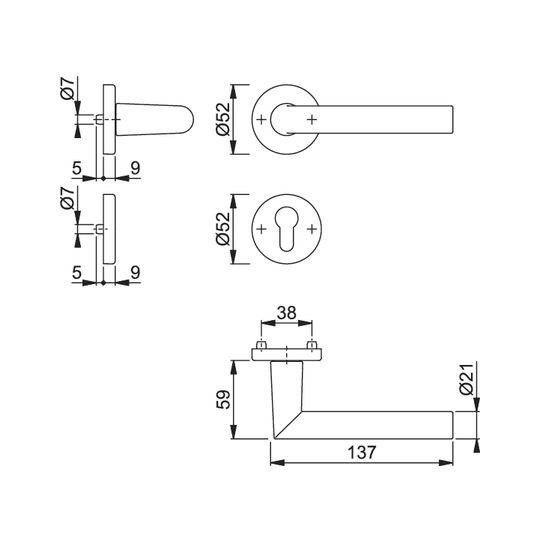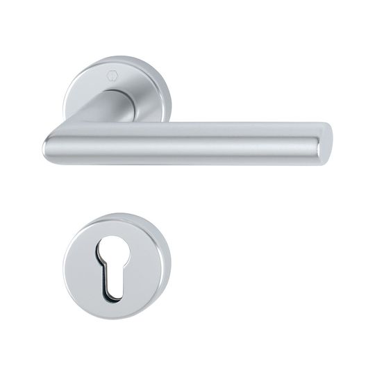 HOPPE Halbgarnitur Amsterdam 1400/42/42S; Produkttyp: Halbgarnitur; Produkttyp (Hersteller): Halbgarnitur; Ausführung: Rosette; Befestigungsart Drückerrosette (innen): verdeckt verschraubt; Befestigungsart Schlüsselrosette (innen): verdeckt verschraubt; Befestigungstechnik: mit Stütznocken; Form Drückerrosette: rund; Form Schlüsselrosette (innen): rund; Vierkant: 8 mm; Material: Aluminium; Form Türgriff (innen): Gehrung; Durchmesser Türgriff (innen): 21; Durchmesser Schlüsselrosette: 52 mm; Länge Türgriff (innen): 137; Höhe Türgriff (innen): 59; Durchmesser Drückerrosette (innen): 52 mm; Höhe Drückerrosette (innen): 9 mm; Höhe Schlüsselrosette (innen): 9 mm; Lagerung: wartungsfreies Gleitlager; Einsatzbereich: Zimmertür; Türart: Vollblatt; Türwerkstoff: Holz,Stahl; Anwendung: innen; Lochung: Profilzylinder gelocht; DIN-Richtung: DIN Links-Rechts; Farbe: silber; Farbton: naturfarben; Oberfläche: eloxiert; Ausführung Vierkant: ohne Stift
