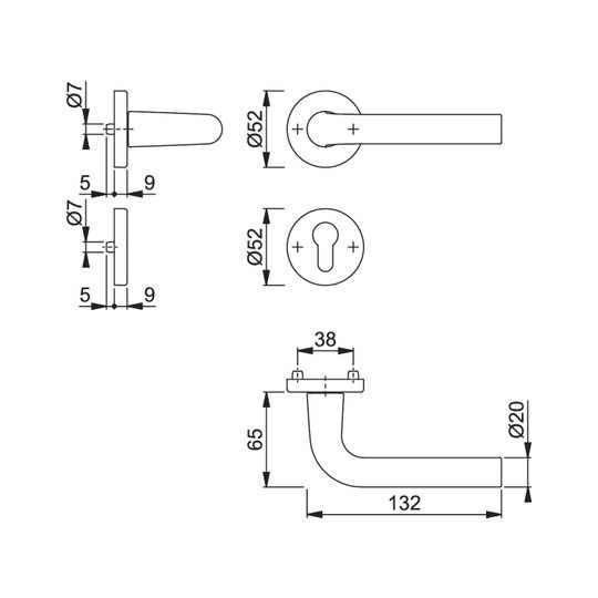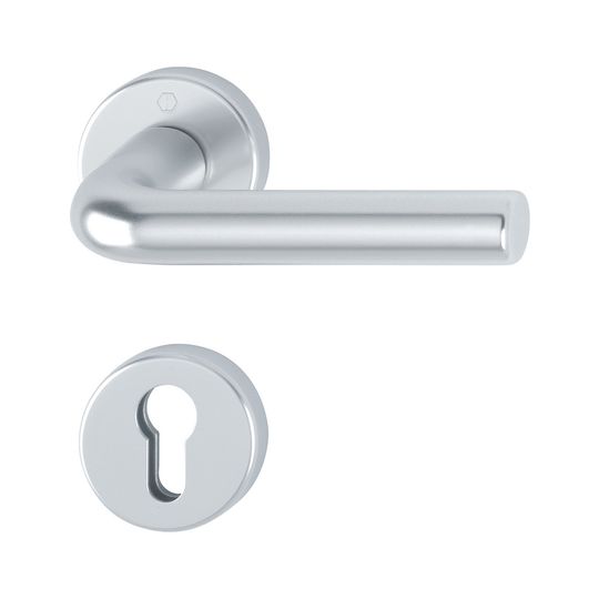 HOPPE Halbgarnitur Bonn 150/42/42S; Produkttyp: Halbgarnitur; Produkttyp (Hersteller): Halbgarnitur; Ausführung: Rosette; Befestigungsart Drückerrosette (innen): verdeckt verschraubt; Befestigungsart Schlüsselrosette (innen): verdeckt verschraubt; Befestigungstechnik: mit Stütznocken; Form Drückerrosette: rund; Form Schlüsselrosette (innen): rund; Vierkant: 8 mm; Material: Aluminium; Form Türgriff (innen): gebogen; Durchmesser Türgriff (innen): 20; Durchmesser Schlüsselrosette: 52 mm; Länge Türgriff (innen): 132; Höhe Türgriff (innen): 65; Durchmesser Drückerrosette (innen): 52 mm; Höhe Drückerrosette (innen): 9 mm; Höhe Schlüsselrosette (innen): 9 mm; Lagerung: wartungsfreies Gleitlager; Einsatzbereich: Zimmertür; Türart: Vollblatt; Türwerkstoff: Holz,Stahl; Anwendung: innen; Lochung: Profilzylinder gelocht; DIN-Richtung: DIN Links-Rechts; Farbe: silber; Farbton: naturfarben; Oberfläche: eloxiert; Ausführung Vierkant: ohne Stift