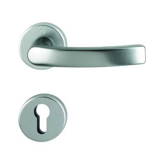HOPPE Halbgarnitur Luxembourg 199/42/42S; Produkttyp: Halbgarnitur; Produkttyp (Hersteller): Halbgarnitur; Ausführung: Rosette; Befestigungsart Drückerrosette (innen): verdeckt verschraubt; Befestigungsart Schlüsselrosette (innen): verdeckt verschraubt; Befestigungstechnik: mit Stütznocken; Form Drückerrosette: rund; Form Schlüsselrosette (innen): rund; Vierkant: 8 mm; Material: Aluminium; Form Türgriff (innen): gebogen; Durchmesser Schlüsselrosette: 52 mm; Länge Türgriff (innen): 132; Höhe Türgriff (innen): 58; Durchmesser Drückerrosette (innen): 52 mm; Höhe Drückerrosette (innen): 9 mm; Höhe Schlüsselrosette (innen): 9 mm; Lagerung: wartungsfreies Gleitlager; Einsatzbereich: Zimmertür; Türart: Vollblatt; Türwerkstoff: Holz,Stahl; Lochung: Profilzylinder gelocht; DIN-Richtung: DIN Links-Rechts; Farbe: grau; Farbton: stahlfarbig; Oberfläche: eloxiert; Ausführung Vierkant: ohne Stift