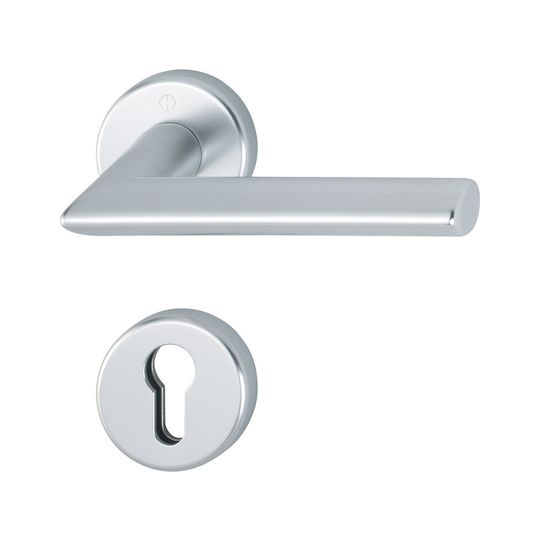 HOPPE Halbgarnitur Stockholm 1140/42/42S; Produkttyp: Halbgarnitur; Produkttyp (Hersteller): Halbgarnitur; Ausführung: Rosette; Befestigungsart Drückerrosette (innen): verdeckt verschraubt; Befestigungsart Schlüsselrosette (innen): verdeckt verschraubt; Befestigungstechnik: mit Stütznocken; Form Drückerrosette: rund; Form Schlüsselrosette (innen): rund; Vierkant: 8 mm; Material: Aluminium; Form Türgriff (innen): Gehrung; Durchmesser Schlüsselrosette: 52 mm; Länge Türgriff (innen): 132; Höhe Türgriff (innen): 61; Durchmesser Drückerrosette (innen): 52 mm; Höhe Drückerrosette (innen): 9 mm; Höhe Schlüsselrosette (innen): 9 mm; Lagerung: wartungsfreies Gleitlager; Einsatzbereich: Zimmertür; Türart: Vollblatt; Türwerkstoff: Holz,Stahl; Anwendung: innen; Lochung: Profilzylinder gelocht; DIN-Richtung: DIN Links-Rechts; Farbe: silber; Farbton: naturfarben; Oberfläche: eloxiert; Ausführung Vierkant: ohne Stift