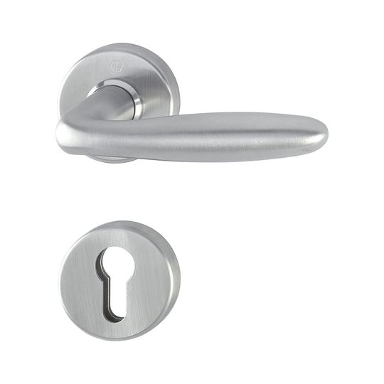 HOPPE Halbgarnitur Verona E1800Z/42/42S; Produkttyp: Halbgarnitur; Produkttyp (Hersteller): Halbgarnitur; Ausführung: Rosette; Befestigungsart Drückerrosette (innen): verdeckt verschraubt; Befestigungsart Schlüsselrosette (innen): verdeckt verschraubt; Befestigungstechnik: mit Stütznocken; Form Drückerrosette: rund; Form Schlüsselrosette (innen): rund; Vierkant: 8 mm; Material: Edelstahl; Form Türgriff (innen): Design; Durchmesser Schlüsselrosette: 52 mm; Länge Türgriff (innen): 123; Höhe Türgriff (innen): 56; Durchmesser Drückerrosette (innen): 52 mm; Höhe Drückerrosette (innen): 8 mm; Höhe Schlüsselrosette (innen): 8 mm; Lagerung: wartungsfreies Gleitlager; Einsatzbereich: Zimmertür; Türart: Vollblatt; Türwerkstoff: Holz,Stahl; Anwendung: innen; Lochung: Profilzylinder gelocht; DIN-Richtung: DIN Links-Rechts; Farbe: grau; Farbton: edelstahl matt; Ausführung Vierkant: ohne Stift