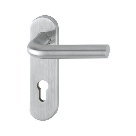 HOPPE Drückergarnitur Bonn E150Z/353K; Produkttyp: Drückergarnitur; Produkttyp (Hersteller): Drückergarnitur; Ausführung: Kurzschild; Befestigungsart: verdeckt verschraubt; Befestigungstechnik: mit Stütznocken; Form: oval; Vierkant: 8 mm; Material: Edelstahl; Material Unterkonstruktion: Stahl; Form Türgriff (innen): L-Form; Form Türgriff (außen): L-Form; Durchmesser Türgriff (innen): 20 mm; Durchmesser Türgriff (außen): 20 mm; Länge Türgriff (innen): 130 mm; Länge Türgriff (außen): 130 mm; Höhe Türgriff (innen): 68 mm; Höhe Türgriff (außen): 68 mm; Schildbreite außen: 44 mm; Schildbreite innen: 44 mm; Schildlänge außen: 165 mm; Schildlänge innen: 166 mm; Schildstärke außen: 8 mm; Schildstärke innen: 8 mm; Lagerung: wartungsfreies Gleitlager; Einsatzbereich: Objekttür; Türart: Vollblatt; Türwerkstoff: Stahl,Holz; Norm: DIN EN 1906; Lochung: Profilzylinder gelocht; Entfernung: 72 mm; DIN-Richtung: DIN Links-Rechts; Farbe: grau; Farbton: edelstahl matt; Ausführung Vierkant: Vierkantstift; Türstärke min.: 35 mm; Türstärke max.: 45 mm