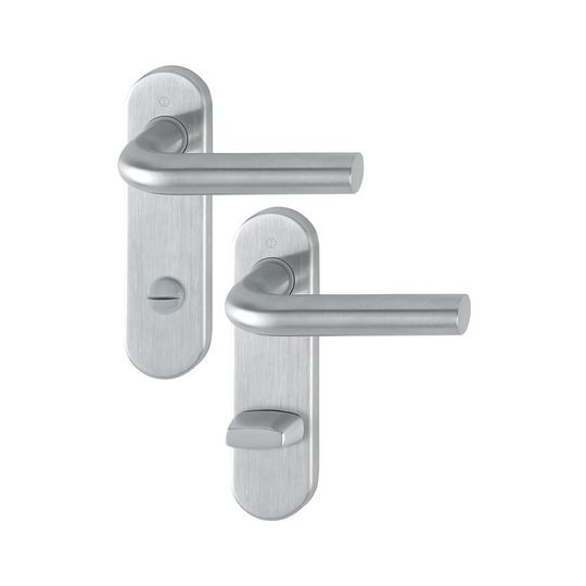 HOPPE Drückergarnitur Bonn E150Z/353K; Produkttyp: Drückergarnitur; Produkttyp (Hersteller): Drückergarnitur; Ausführung: Kurzschild; Befestigungsart: verdeckt verschraubt; Befestigungstechnik: mit Stütznocken; Form: oval; Vierkant: 8 mm; Material: Edelstahl; Material Unterkonstruktion: Stahl; Form Türgriff (innen): L-Form; Form Türgriff (außen): L-Form; Durchmesser Türgriff (innen): 20 mm; Durchmesser Türgriff (außen): 20 mm; Länge Türgriff (innen): 130 mm; Länge Türgriff (außen): 130 mm; Höhe Türgriff (innen): 68 mm; Höhe Türgriff (außen): 68 mm; Schildbreite außen: 44 mm; Schildbreite innen: 44 mm; Schildlänge außen: 165 mm; Schildlänge innen: 166 mm; Schildstärke außen: 8 mm; Schildstärke innen: 8 mm; Lagerung: wartungsfreies Gleitlager; Einsatzbereich: Objekttür; Türart: Vollblatt; Türwerkstoff: Stahl,Holz; Norm: DIN EN 1906; Lochung: WC Schlitzkopf; Entfernung: 78 mm; Riegel-Vierkant: 8 mm; DIN-Richtung: DIN Links-Rechts; Farbe: grau; Farbton: edelstahl matt; Ausführung Vierkant: Vierkantstift; Türstärke min.: 40 mm; Türstärke max.: 45 mm
