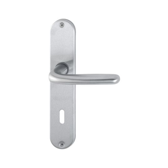 HOPPE Drückergarnitur Cardiff E1850Z/302; Produkttyp: Drückergarnitur; Produkttyp (Hersteller): Drückergarnitur; Ausführung: Langschild; Befestigungsart: sichtbar verschraubt; Befestigungstechnik: ohne Stütznocken; Form: oval; Vierkant: 8 mm; Material: Edelstahl; Form Türgriff (innen): L-Form; Form Türgriff (außen): L-Form; Länge Türgriff (innen): 124 mm; Länge Türgriff (außen): 124 mm; Höhe Türgriff (innen): 62 mm; Höhe Türgriff (außen): 62 mm; Schildbreite außen: 42 mm; Schildbreite innen: 42 mm; Schildlänge außen: 220 mm; Schildlänge innen: 220 mm; Schildstärke außen: 6 mm; Schildstärke innen: 6 mm; Lagerung: wartungsfreies Gleitlager; Einsatzbereich: Zimmertür; Türart: Vollblatt; Türwerkstoff: Stahl,Holz; Lochung: Buntbart gelocht; Entfernung: 72 mm; DIN-Richtung: DIN Links-Rechts; Farbe: grau; Farbton: edelstahl matt; Ausführung Vierkant: Profilstift; Türstärke min.: 37 mm; Türstärke max.: 47 mm