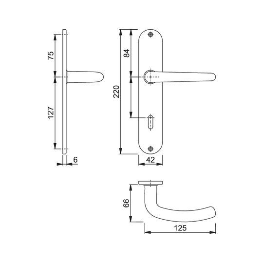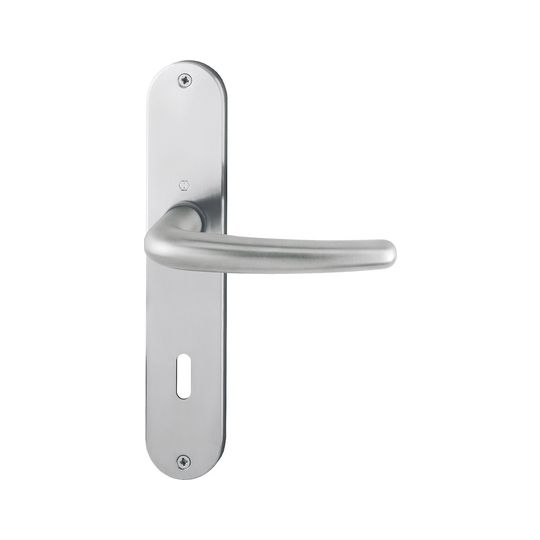 HOPPE Drückergarnitur Denver E1310Z/302; Produkttyp: Drückergarnitur; Produkttyp (Hersteller): Drückergarnitur; Ausführung: Langschild; Befestigungsart: sichtbar verschraubt; Befestigungstechnik: ohne Stütznocken; Form: oval; Vierkant: 8 mm; Material: Edelstahl; Form Türgriff (innen): gebogen; Form Türgriff (außen): gebogen; Länge Türgriff (innen): 125 mm; Länge Türgriff (außen): 125 mm; Höhe Türgriff (innen): 66 mm; Höhe Türgriff (außen): 66 mm; Schildbreite außen: 42 mm; Schildbreite innen: 42 mm; Schildlänge außen: 220 mm; Schildlänge innen: 220 mm; Schildstärke außen: 6 mm; Schildstärke innen: 6 mm; Lagerung: wartungsfreies Gleitlager; Einsatzbereich: Objekttür; Türart: Vollblatt; Türwerkstoff: Stahl,Holz; Norm: DIN EN 1906; Lochung: Buntbart gelocht; Entfernung: 72 mm; DIN-Richtung: DIN Links-Rechts; Farbe: grau; Farbton: edelstahl matt; Ausführung Vierkant: Vierkantstift; Türstärke min.: 35 mm; Türstärke max.: 45 mm