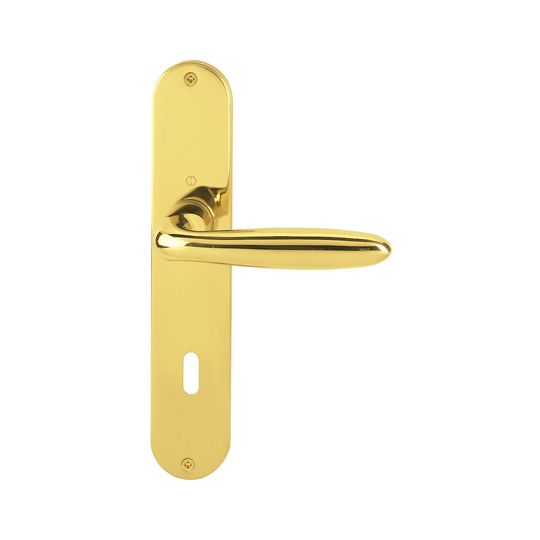 HOPPE Drückergarnitur Verona M151/302; Produkttyp: Drückergarnitur; Produkttyp (Hersteller): Drückergarnitur; Ausführung: Langschild; Befestigungsart: sichtbar verschraubt; Befestigungstechnik: ohne Stütznocken; Form: oval; Vierkant: 8 mm; Material: Messing; Form Türgriff (innen): L-Form; Form Türgriff (außen): L-Form; Länge Türgriff (innen): 122 mm; Länge Türgriff (außen): 122 mm; Höhe Türgriff (innen): 53 mm; Höhe Türgriff (außen): 53 mm; Schildbreite außen: 41 mm; Schildbreite innen: 41 mm; Schildlänge außen: 219 mm; Schildlänge innen: 219 mm; Schildstärke außen: 5 mm; Schildstärke innen: 5 mm; Lagerung: wartungsfreies Gleitlager; Einsatzbereich: Objekttür; Türart: Vollblatt; Türwerkstoff: Holz,Stahl; Norm: DIN EN 1906; Lochung: Buntbart gelocht; Entfernung: 72 mm; DIN-Richtung: DIN Links-Rechts; Farbe: gelb; Farbton: messing poliert; Ausführung Vierkant: Vierkantstift; Türstärke min.: 37 mm; Türstärke max.: 47 mm