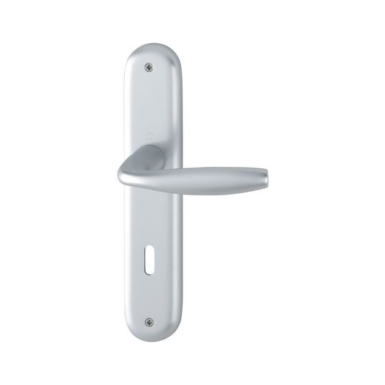 HOPPE Drückergarnitur New York 1810/273P; Produkttyp: Drückergarnitur; Produkttyp (Hersteller): Drückergarnitur; Ausführung: Langschild; Befestigungsart: sichtbar verschraubt; Befestigungstechnik: ohne Stütznocken; Form: oval; Vierkant: 8 mm; Material: Aluminium; Form Türgriff (innen): gebogen; Form Türgriff (außen): gebogen; Länge Türgriff (innen): 127 mm; Länge Türgriff (außen): 127 mm; Höhe Türgriff (innen): 56 mm; Höhe Türgriff (außen): 56 mm; Schildbreite außen: 46 mm; Schildbreite innen: 46 mm; Schildlänge außen: 240 mm; Schildlänge innen: 240 mm; Schildstärke außen: 9 mm; Schildstärke innen: 9 mm; Lagerung: mit Rückholfeder,wartungsfreies Gleitlager; Einsatzbereich: Objekttür; Türart: Vollblatt; Türwerkstoff: Holz,Stahl; Norm: DIN EN 1906; Lochung: Buntbart gelocht; Entfernung: 72 mm; DIN-Richtung: DIN Links-Rechts; Farbe: silber; Farbton: naturfarben; Oberfläche: eloxiert; Ausführung Vierkant: Vierkantstift; Türstärke min.: 37 mm; Türstärke max.: 42 mm
