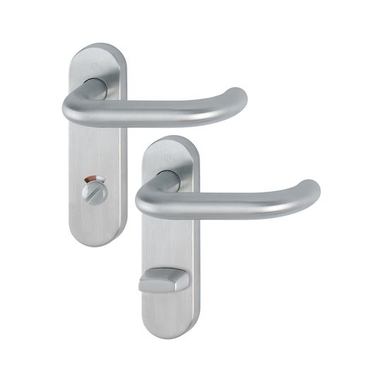 HOPPE Drückergarnitur Paris E138/353KH; Produkttyp: Drückergarnitur; Produkttyp (Hersteller): Drückergarnitur; Ausführung: Kurzschild; Befestigungsart: verdeckt verschraubt; Befestigungstechnik: mit Stütznocken; Form: oval; Vierkant: 8 mm; Material: Edelstahl; Material Unterkonstruktion: Stahl; Form Türgriff (innen): U-Form; Form Türgriff (außen): U-Form; Durchmesser Türgriff (innen): 20 mm; Durchmesser Türgriff (außen): 20 mm; Länge Türgriff (innen): 141 mm; Länge Türgriff (außen): 141 mm; Höhe Türgriff (innen): 66 mm; Höhe Türgriff (außen): 66 mm; Schildbreite außen: 44 mm; Schildbreite innen: 44 mm; Schildlänge außen: 165 mm; Schildlänge innen: 165 mm; Schildstärke außen: 10 mm; Schildstärke innen: 10 mm; Lagerung: mit Rückholfeder,wartungsfreies Gleitlager,festdrehbar; Einsatzbereich: Objekttür; Türart: Vollblatt; Türwerkstoff: Stahl,Holz; Norm: DIN EN 1906; Lochung: WC Schlitzkopf; Entfernung: 78 mm; Riegel-Vierkant: 8 mm; DIN-Richtung: DIN Links-Rechts; Farbe: grau; Farbton: edelstahl matt; Ausführung Vierkant: Profilstift; Türstärke min.: 40 mm; Türstärke max.: 45 mm