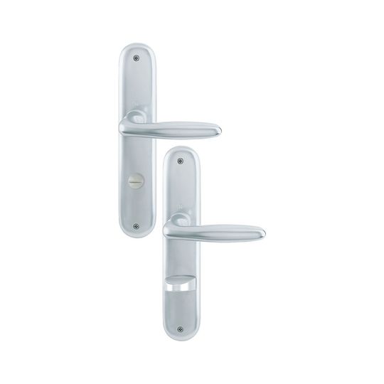 HOPPE Drückergarnitur Verona 1510/273P; Produkttyp: Drückergarnitur; Produkttyp (Hersteller): Drückergarnitur; Ausführung: Langschild; Befestigungsart: sichtbar verschraubt; Befestigungstechnik: ohne Stütznocken; Form: oval; Vierkant: 8 mm; Material: Aluminium; Form Türgriff (innen): L-Form; Form Türgriff (außen): L-Form; Länge Türgriff (innen): 124 mm; Länge Türgriff (außen): 124 mm; Höhe Türgriff (innen): 54 mm; Höhe Türgriff (außen): 54 mm; Schildbreite außen: 54 mm; Schildbreite innen: 54 mm; Schildlänge außen: 250 mm; Schildlänge innen: 250 mm; Schildstärke außen: 8 mm; Schildstärke innen: 8 mm; Lagerung: mit Rückholfeder,wartungsfreies Gleitlager; Einsatzbereich: Objekttür; Türart: Vollblatt; Türwerkstoff: Holz,Stahl; Norm: DIN EN 1906; Lochung: WC Schlitzkopf; Entfernung: 78 mm; Riegel-Vierkant: 8 mm; DIN-Richtung: DIN Links-Rechts; Farbe: silber; Farbton: naturfarben; Oberfläche: eloxiert; Ausführung Vierkant: Vierkantstift; Türstärke min.: 37 mm; Türstärke max.: 42 mm
