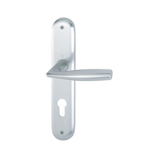 HOPPE Drückergarnitur Vitória 1515/273P; Produkttyp: Drückergarnitur; Produkttyp (Hersteller): Drückergarnitur; Ausführung: Langschild; Befestigungsart: sichtbar verschraubt; Befestigungstechnik: ohne Stütznocken; Form: oval; Vierkant: 8 mm; Material: Aluminium; Form Türgriff (innen): L-Form; Form Türgriff (außen): L-Form; Länge Türgriff (innen): 124 mm; Länge Türgriff (außen): 124 mm; Höhe Türgriff (innen): 60 mm; Höhe Türgriff (außen): 60 mm; Schildbreite außen: 46 mm; Schildbreite innen: 46 mm; Schildlänge außen: 240 mm; Schildlänge innen: 240 mm; Schildstärke außen: 9 mm; Schildstärke innen: 9 mm; Lagerung: mit Rückholfeder,wartungsfreies Gleitlager; Einsatzbereich: Objekttür; Türart: Vollblatt; Türwerkstoff: Holz,Stahl; Norm: DIN EN 1906; Lochung: Profilzylinder gelocht; Entfernung: 72 mm; DIN-Richtung: DIN Links-Rechts; Farbe: silber; Farbton: naturfarben; Oberfläche: eloxiert; Ausführung Vierkant: Vierkantstift; Türstärke min.: 35 mm; Türstärke max.: 45 mm