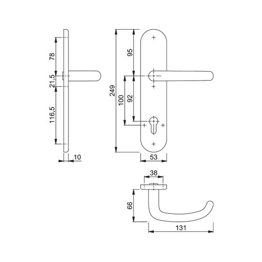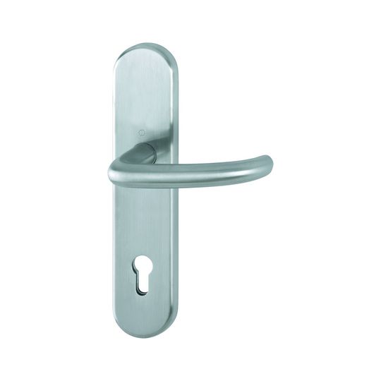 HOPPE Halbgarnitur San Francisco E1301F/3310; Produkttyp: Halbgarnitur; Produkttyp (Hersteller): Halbgarnitur; Ausführung: Langschild; Befestigungsart: verdeckt verschraubt; Befestigungstechnik: ohne Stütznocken; Form: oval; Vierkant: 10 mm; Material: Edelstahl; Material Unterkonstruktion: Stahl; Form Türgriff (innen): gebogen; Länge Türgriff (innen): 131 mm; Höhe Türgriff (innen): 66 mm; Schildbreite außen: 53 mm; Schildbreite innen: 53 mm; Schildlänge außen: 249 mm; Schildlänge innen: 249 mm; Schildstärke außen: 10 mm; Schildstärke innen: 10 mm; Lagerung: festdrehbar,wartungsfreies Gleitlager; Einsatzbereich: Haustür; Türart: Vollblatt; Türwerkstoff: Holz,Stahl; Anwendung: innen; Lochung: Profilzylinder gelocht; Entfernung: 92 mm; DIN-Richtung: DIN Links-Rechts; Farbe: grau; Farbton: edelstahl matt; Ausführung Vierkant: Spreizstift