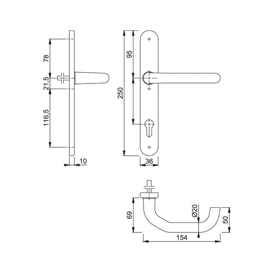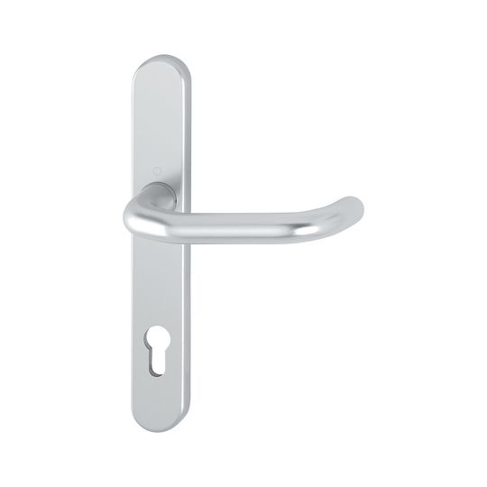 HOPPE Halbgarnitur Paris RD-138GF/3357SN; Produkttyp: Halbgarnitur; Produkttyp (Hersteller): Halbgarnitur; Ausführung: Langschild; Befestigungsart: verdeckt verschraubt; Befestigungstechnik: ohne Stütznocken; Form: oval; Vierkant: 9 mm; Material: Aluminium; Material Unterkonstruktion: Zamak; Form Türgriff (innen): gekröpft; Länge Türgriff (innen): 154 mm; Höhe Türgriff (innen): 69 mm; Schildbreite außen: 36 mm; Schildbreite innen: 36 mm; Schildlänge außen: 250 mm; Schildlänge innen: 250 mm; Schildstärke außen: 10 mm; Schildstärke innen: 10 mm; Lagerung: mit Rückholfeder,festdrehbar,wartungsfreies Gleitlager; Einsatzbereich: Objekttür; Türart: Rohrrahmen; Türwerkstoff: Aluminium,Kunststoff; Norm: DIN EN 179,DIN 18273; Anwendung: innen; Lochung: Profilzylinder gelocht; Entfernung: 92 mm; DIN-Richtung: DIN Links-Rechts; Farbe: silber; Farbton: naturfarben; Oberfläche: eloxiert; Ausführung Vierkant: Vierkantstift; Türstärke min.: 45 mm; Türstärke max.: 65 mm
