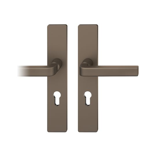 FSB Drückergarnitur 12 1004; Produkttyp: Drückergarnitur; Produkttyp (Hersteller): Drückergarnitur; Ausführung: Langschild; Befestigungsart: verdeckt verschraubt; Befestigungstechnik: mit Stütznocken; Form: eckig; Vierkant: 8 mm; Material: Aluminium; Material Unterkonstruktion: Kunststoff-Edelstahl verstärkt; Form Türgriff (innen): Design; Form Türgriff (außen): Design; Breite Türgriff (innen): 19 mm; Breite Türgriff (außen): 19 mm; Länge Türgriff (innen): 133 mm; Länge Türgriff (außen): 133 mm; Höhe Türgriff (innen): 58 mm; Höhe Türgriff (außen): 58 mm; Schildbreite außen: 45 mm; Schildbreite innen: 45 mm; Schildlänge außen: 245 mm; Schildlänge innen: 245 mm; Schildstärke außen: 7 mm; Schildstärke innen: 7 mm; Lagerung: Adapter-Standardlager,festdrehbar; Einsatzbereich: Haustür; Türart: Vollblatt; Türwerkstoff: Holz,Stahl; Norm: DIN EN 1906; Lochung: Profilzylinder gelocht; Entfernung: 92 mm; DIN-Richtung: DIN Links-Rechts; Farbe: braun; Farbton: mittelbronzefarbig; Oberfläche: gestrahlt,eloxiert; Design Türdrücker: David Chipperfield; Ausführung Vierkant: Stabilstift; Betätigungswinkel max.: 45 °; Türstärke min.: 39 mm; Türstärke max.: 58 mm