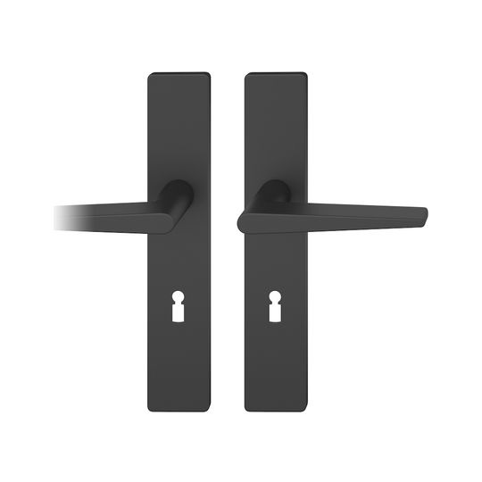 FSB Drückergarnitur 12 1005; Produkttyp: Drückergarnitur; Produkttyp (Hersteller): Drückergarnitur; Ausführung: Langschild; Befestigungsart: verdeckt verschraubt; Befestigungstechnik: mit Stütznocken; Form: eckig; Vierkant: 8 mm; Material: Aluminium; Material Unterkonstruktion: Kunststoff-Edelstahl verstärkt; Form Türgriff (innen): L-Form; Form Türgriff (außen): L-Form; Länge Türgriff (innen): 128 mm; Länge Türgriff (außen): 128 mm; Höhe Türgriff (innen): 60 mm; Höhe Türgriff (außen): 60 mm; Schildbreite außen: 45 mm; Schildbreite innen: 45 mm; Schildlänge außen: 245 mm; Schildlänge innen: 245 mm; Schildstärke außen: 7 mm; Schildstärke innen: 7 mm; Lagerung: Adapter-Standardlager,festdrehbar; Einsatzbereich: Zimmertür; Türart: Vollblatt; Türwerkstoff: Holz,Stahl; Norm: DIN EN 1906; Lochung: Buntbart gelocht; Entfernung: 72 mm; DIN-Richtung: DIN Links-Rechts; Farbe: schwarz; Oberfläche: gestrahlt,eloxiert; Ausführung Vierkant: Stabilstift; Betätigungswinkel max.: 45 °; Türstärke min.: 39 mm; Türstärke max.: 58 mm