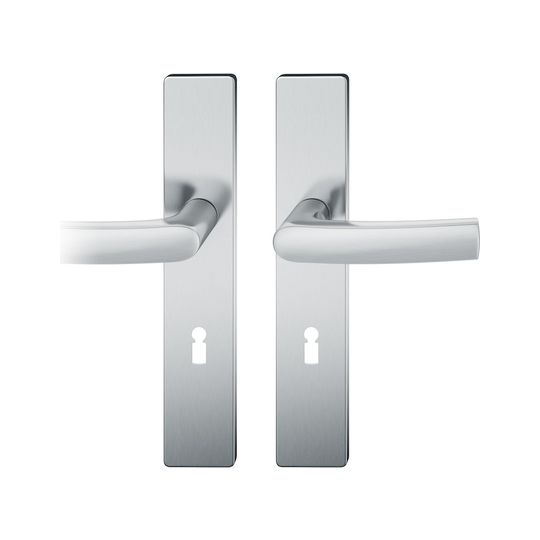 FSB Drückergarnitur 12 1015; Produkttyp: Drückergarnitur; Produkttyp (Hersteller): Drückergarnitur; Ausführung: Langschild; Befestigungsart: verdeckt verschraubt; Befestigungstechnik: mit Stütznocken; Form: eckig; Vierkant: 8 mm; Material: Edelstahl; Form Türgriff (innen): gebogen; Form Türgriff (außen): gebogen; Breite Türgriff (innen): 22 mm; Breite Türgriff (außen): 22 mm; Länge Türgriff (innen): 122 mm; Länge Türgriff (außen): 122 mm; Höhe Türgriff (innen): 55 mm; Höhe Türgriff (außen): 55 mm; Schildbreite außen: 45 mm; Schildbreite innen: 45 mm; Schildlänge außen: 245 mm; Schildlänge innen: 245 mm; Schildstärke außen: 7 mm; Schildstärke innen: 7 mm; Lagerung: Adapter-Standardlager,festdrehbar; Einsatzbereich: Zimmertür; Türart: Vollblatt; Türwerkstoff: Holz,Stahl; Norm: DIN EN 1906; Lochung: Buntbart gelocht; Entfernung: 72 mm; DIN-Richtung: DIN Links-Rechts; Farbe: grau; Farbton: edelstahl; Oberfläche: poliert; Ausführung Vierkant: Stabilstift; Betätigungswinkel max.: 45 °; Türstärke min.: 39 mm; Türstärke max.: 58 mm