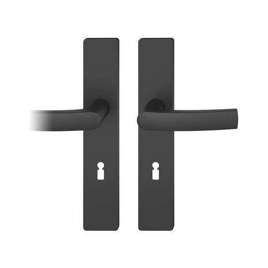 FSB Drückergarnitur 12 1015; Produkttyp: Drückergarnitur; Produkttyp (Hersteller): Drückergarnitur; Ausführung: Langschild; Befestigungsart: verdeckt verschraubt; Befestigungstechnik: mit Stütznocken; Form: eckig; Vierkant: 8 mm; Material: Aluminium; Form Türgriff (innen): gebogen; Form Türgriff (außen): gebogen; Breite Türgriff (innen): 22 mm; Breite Türgriff (außen): 22 mm; Länge Türgriff (innen): 122 mm; Länge Türgriff (außen): 122 mm; Höhe Türgriff (innen): 55 mm; Höhe Türgriff (außen): 55 mm; Schildbreite außen: 45 mm; Schildbreite innen: 45 mm; Schildlänge außen: 245 mm; Schildlänge innen: 245 mm; Schildstärke außen: 7 mm; Schildstärke innen: 7 mm; Lagerung: Adapter-Standardlager,festdrehbar; Einsatzbereich: Zimmertür; Türart: Vollblatt; Türwerkstoff: Holz,Stahl; Norm: DIN EN 1906; Lochung: Buntbart gelocht; Entfernung: 72 mm; DIN-Richtung: DIN Links-Rechts; Farbe: schwarz; Oberfläche: gestrahlt,eloxiert; Ausführung Vierkant: Stabilstift; Betätigungswinkel max.: 45 °; Türstärke min.: 39 mm; Türstärke max.: 58 mm
