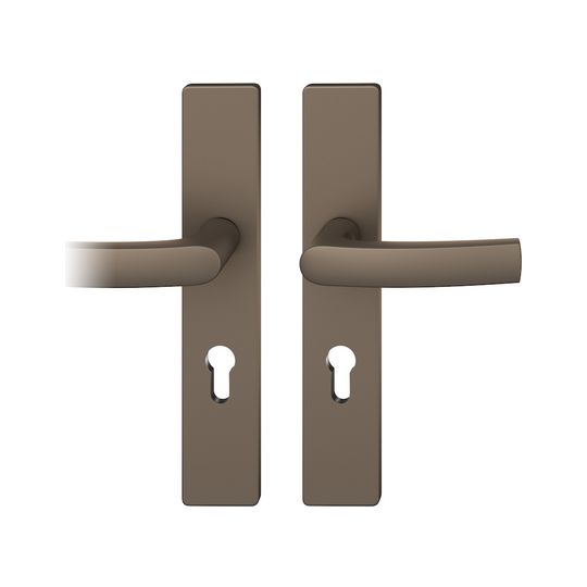 FSB Drückergarnitur 12 1015; Produkttyp: Drückergarnitur; Produkttyp (Hersteller): Drückergarnitur; Ausführung: Langschild; Befestigungsart: verdeckt verschraubt; Befestigungstechnik: mit Stütznocken; Form: eckig; Vierkant: 8 mm; Material: Aluminium; Form Türgriff (innen): gebogen; Form Türgriff (außen): gebogen; Breite Türgriff (innen): 22 mm; Breite Türgriff (außen): 22 mm; Länge Türgriff (innen): 122 mm; Länge Türgriff (außen): 122 mm; Höhe Türgriff (innen): 55 mm; Höhe Türgriff (außen): 55 mm; Schildbreite außen: 45 mm; Schildbreite innen: 45 mm; Schildlänge außen: 245 mm; Schildlänge innen: 245 mm; Schildstärke außen: 7 mm; Schildstärke innen: 7 mm; Lagerung: Adapter-Standardlager,festdrehbar; Einsatzbereich: Zimmertür; Türart: Vollblatt; Türwerkstoff: Holz,Stahl; Norm: DIN EN 1906; Lochung: Profilzylinder gelocht; Entfernung: 72 mm; DIN-Richtung: DIN Links-Rechts; Farbe: braun; Farbton: mittelbronzefarbig; Oberfläche: gestrahlt,eloxiert; Ausführung Vierkant: Stabilstift; Betätigungswinkel max.: 45 °; Türstärke min.: 39 mm; Türstärke max.: 58 mm
