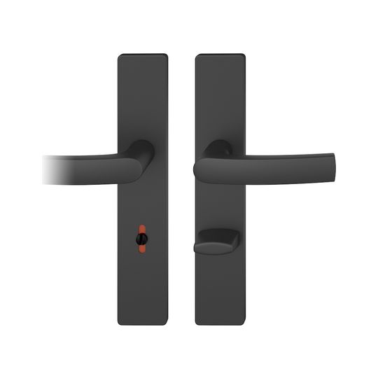 FSB Drückergarnitur 12 1015; Produkttyp: Drückergarnitur; Produkttyp (Hersteller): Drückergarnitur; Ausführung: Langschild; Befestigungsart: verdeckt verschraubt; Befestigungstechnik: mit Stütznocken; Form: eckig; Vierkant: 8 mm; Material: Aluminium; Form Türgriff (innen): gebogen; Form Türgriff (außen): gebogen; Breite Türgriff (innen): 22 mm; Breite Türgriff (außen): 22 mm; Länge Türgriff (innen): 122 mm; Länge Türgriff (außen): 122 mm; Höhe Türgriff (innen): 55 mm; Höhe Türgriff (außen): 55 mm; Schildbreite außen: 45 mm; Schildbreite innen: 45 mm; Schildlänge außen: 245 mm; Schildlänge innen: 245 mm; Schildstärke außen: 7 mm; Schildstärke innen: 7 mm; Lagerung: Adapter-Standardlager,festdrehbar; Einsatzbereich: Zimmertür; Türart: Vollblatt; Türwerkstoff: Holz,Stahl; Norm: DIN EN 1906; Lochung: WC Schauscheibe/Schlitzkopf; Entfernung: 78 mm; Riegel-Vierkant: 8 mm; DIN-Richtung: DIN Links-Rechts; Farbe: schwarz; Oberfläche: gestrahlt,eloxiert; Ausführung Vierkant: Stabilstift; Betätigungswinkel max.: 45 °; Türstärke min.: 39 mm; Türstärke max.: 58 mm