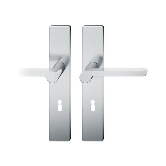 FSB Drückergarnitur 12 1021; Produkttyp: Drückergarnitur; Produkttyp (Hersteller): Drückergarnitur; Ausführung: Langschild; Befestigungsart: verdeckt verschraubt; Befestigungstechnik: mit Stütznocken; Form: eckig; Vierkant: 8 mm; Material: Edelstahl; Material Unterkonstruktion: Kunststoff-Edelstahl verstärkt; Form Türgriff (innen): Design; Form Türgriff (außen): Design; Breite Türgriff (innen): 20 mm; Breite Türgriff (außen): 20 mm; Länge Türgriff (innen): 137 mm; Länge Türgriff (außen): 137 mm; Höhe Türgriff (innen): 61 mm; Höhe Türgriff (außen): 61 mm; Schildbreite außen: 45 mm; Schildbreite innen: 45 mm; Schildlänge außen: 245 mm; Schildlänge innen: 245 mm; Schildstärke außen: 7 mm; Schildstärke innen: 7 mm; Lagerung: Adapter-Standardlager,festdrehbar; Einsatzbereich: Zimmertür; Türart: Vollblatt; Türwerkstoff: Holz,Stahl; Norm: DIN EN 1906; Lochung: Buntbart gelocht; Entfernung: 72 mm; DIN-Richtung: DIN Links-Rechts; Farbe: grau; Farbton: edelstahl; Oberfläche: poliert; Ausführung Vierkant: Stabilstift; Betätigungswinkel max.: 45 °; Türstärke min.: 39 mm; Türstärke max.: 58 mm