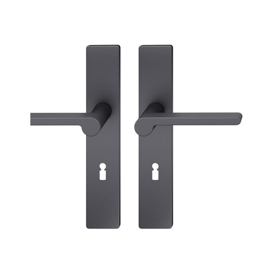 FSB Drückergarnitur 12 1021; Produkttyp: Drückergarnitur; Produkttyp (Hersteller): Drückergarnitur; Ausführung: Langschild; Befestigungsart: verdeckt verschraubt; Befestigungstechnik: mit Stütznocken; Form: eckig; Vierkant: 8 mm; Material: Aluminium; Material Unterkonstruktion: Kunststoff-Edelstahl verstärkt; Form Türgriff (innen): Design; Form Türgriff (außen): Design; Breite Türgriff (innen): 20 mm; Breite Türgriff (außen): 20 mm; Länge Türgriff (innen): 137 mm; Länge Türgriff (außen): 137 mm; Höhe Türgriff (innen): 61 mm; Höhe Türgriff (außen): 61 mm; Schildbreite außen: 45 mm; Schildbreite innen: 45 mm; Schildlänge außen: 245 mm; Schildlänge innen: 245 mm; Schildstärke außen: 7 mm; Schildstärke innen: 7 mm; Lagerung: Adapter-Standardlager,festdrehbar; Einsatzbereich: Zimmertür; Türart: Vollblatt; Türwerkstoff: Holz,Stahl; Norm: DIN EN 1906; Lochung: Buntbart gelocht; Entfernung: 72 mm; DIN-Richtung: DIN Links-Rechts; Farbe: schwarz; Oberfläche: gestrahlt,eloxiert; Ausführung Vierkant: Stabilstift; Betätigungswinkel max.: 45 °; Türstärke min.: 39 mm; Türstärke max.: 58 mm