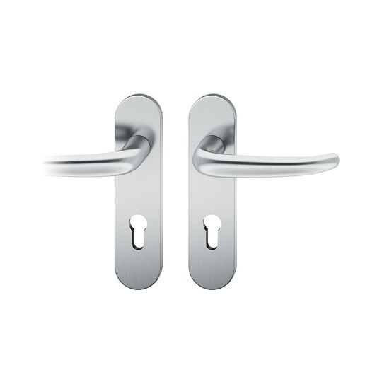 FSB Drückergarnitur 12 1023; Produkttyp: Drückergarnitur; Produkttyp (Hersteller): Drückergarnitur; Ausführung: Kurzschild; Befestigungsart: verdeckt verschraubt; Befestigungstechnik: mit Stütznocken; Form: oval; Vierkant: 8 mm; Material: Edelstahl; Material Unterkonstruktion: Kunststoff; Form Türgriff (innen): gebogen; Form Türgriff (außen): gebogen; Breite Türgriff (innen): 15 mm; Breite Türgriff (außen): 15 mm; Länge Türgriff (innen): 135 mm; Länge Türgriff (außen): 135 mm; Höhe Türgriff (innen): 59 mm; Höhe Türgriff (außen): 59 mm; Schildbreite außen: 45 mm; Schildbreite innen: 45 mm; Schildlänge außen: 185 mm; Schildlänge innen: 185 mm; Schildstärke außen: 7 mm; Schildstärke innen: 7 mm; Lagerung: Adapter-Standardlager,festdrehbar; Einsatzbereich: Zimmertür; Türart: Vollblatt; Türwerkstoff: Holz,Stahl; Norm: DIN EN 1906; Lochung: Profilzylinder gelocht; Entfernung: 72 mm; DIN-Richtung: DIN Links-Rechts; Farbe: grau; Farbton: edelstahl; Oberfläche: poliert; Ausführung Vierkant: Stabilstift; Betätigungswinkel max.: 45 °; Türstärke min.: 39 mm; Türstärke max.: 58 mm