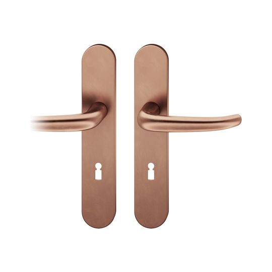FSB Drückergarnitur 12 1023; Produkttyp: Drückergarnitur; Produkttyp (Hersteller): Drückergarnitur; Ausführung: Langschild; Befestigungsart: verdeckt verschraubt; Befestigungstechnik: mit Stütznocken; Form: oval; Vierkant: 8 mm; Material: Bronze; Material Unterkonstruktion: Kunststoff-Edelstahl verstärkt; Form Türgriff (innen): gebogen; Form Türgriff (außen): gebogen; Breite Türgriff (innen): 15 mm; Breite Türgriff (außen): 15 mm; Länge Türgriff (innen): 135 mm; Länge Türgriff (außen): 135 mm; Höhe Türgriff (innen): 59 mm; Höhe Türgriff (außen): 59 mm; Schildbreite außen: 45 mm; Schildbreite innen: 45 mm; Schildlänge außen: 245 mm; Schildlänge innen: 245 mm; Schildstärke außen: 7 mm; Schildstärke innen: 7 mm; Lagerung: Adapter-Standardlager,festdrehbar; Einsatzbereich: Zimmertür; Türart: Vollblatt; Türwerkstoff: Holz,Stahl; Norm: DIN EN 1906; Lochung: Buntbart gelocht; Entfernung: 72 mm; DIN-Richtung: DIN Links-Rechts; Farbe: braun; Farbton: hellbronze; Oberfläche: patiniert gewachst; Ausführung Vierkant: Stabilstift; Betätigungswinkel max.: 45 °; Türstärke min.: 39 mm; Türstärke max.: 58 mm