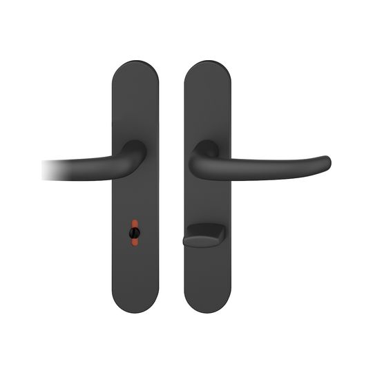 FSB Drückergarnitur 12 1023; Produkttyp: Drückergarnitur; Produkttyp (Hersteller): Drückergarnitur; Ausführung: Langschild; Befestigungsart: verdeckt verschraubt; Befestigungstechnik: mit Stütznocken; Form: oval; Vierkant: 8 mm; Material: Aluminium; Material Unterkonstruktion: Kunststoff-Edelstahl verstärkt; Form Türgriff (innen): gebogen; Form Türgriff (außen): gebogen; Breite Türgriff (innen): 15 mm; Breite Türgriff (außen): 15 mm; Länge Türgriff (innen): 135 mm; Länge Türgriff (außen): 135 mm; Höhe Türgriff (innen): 59 mm; Höhe Türgriff (außen): 59 mm; Schildbreite außen: 45 mm; Schildbreite innen: 45 mm; Schildlänge außen: 245 mm; Schildlänge innen: 245 mm; Schildstärke außen: 7 mm; Schildstärke innen: 7 mm; Lagerung: Adapter-Standardlager,festdrehbar; Einsatzbereich: Zimmertür; Türart: Vollblatt; Türwerkstoff: Holz,Stahl; Norm: DIN EN 1906; Lochung: WC Schauscheibe/Schlitzkopf; Entfernung: 78 mm; Riegel-Vierkant: 8 mm; DIN-Richtung: DIN Links-Rechts; Farbe: schwarz; Oberfläche: gestrahlt,eloxiert; Ausführung Vierkant: Stabilstift; Betätigungswinkel max.: 45 °; Türstärke min.: 39 mm; Türstärke max.: 58 mm