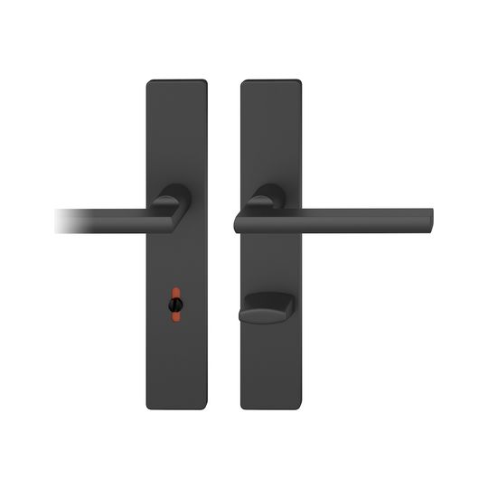 FSB Drückergarnitur 12 1035; Produkttyp: Drückergarnitur; Produkttyp (Hersteller): Drückergarnitur; Ausführung: Langschild; Befestigungsart: verdeckt verschraubt; Befestigungstechnik: mit Stütznocken; Form: eckig; Vierkant: 8 mm; Material: Aluminium; Material Unterkonstruktion: Kunststoff-Edelstahl verstärkt; Form Türgriff (innen): L-Form; Form Türgriff (außen): L-Form; Länge Türgriff (innen): 137 mm; Länge Türgriff (außen): 137 mm; Höhe Türgriff (innen): 58 mm; Höhe Türgriff (außen): 58 mm; Schildbreite außen: 45 mm; Schildbreite innen: 45 mm; Schildlänge außen: 245 mm; Schildlänge innen: 245 mm; Schildstärke außen: 7 mm; Schildstärke innen: 7 mm; Lagerung: Adapter-Standardlager,festdrehbar; Einsatzbereich: Zimmertür; Türart: Vollblatt; Türwerkstoff: Holz,Stahl; Norm: DIN EN 1906; Lochung: WC Schauscheibe/Schlitzkopf; Entfernung: 78 mm; Riegel-Vierkant: 8 mm; DIN-Richtung: DIN Links-Rechts; Farbe: schwarz; Oberfläche: gestrahlt,eloxiert; Design Türdrücker: Heike Falkenberg; Ausführung Vierkant: Stabilstift; Betätigungswinkel max.: 45 °; Türstärke min.: 39 mm; Türstärke max.: 58 mm