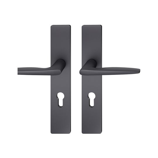 FSB Drückergarnitur 12 1058; Produkttyp: Drückergarnitur; Produkttyp (Hersteller): Drückergarnitur; Ausführung: Langschild; Befestigungsart: verdeckt verschraubt; Befestigungstechnik: mit Stütznocken; Form: eckig; Vierkant: 8 mm; Material: Aluminium; Material Unterkonstruktion: Kunststoff-Edelstahl verstärkt; Form Türgriff (innen): Design; Form Türgriff (außen): Design; Länge Türgriff (innen): 128 mm; Länge Türgriff (außen): 128 mm; Höhe Türgriff (innen): 58 mm; Höhe Türgriff (außen): 58 mm; Schildbreite außen: 45 mm; Schildbreite innen: 45 mm; Schildlänge außen: 245 mm; Schildlänge innen: 245 mm; Schildstärke außen: 7 mm; Schildstärke innen: 7 mm; Lagerung: Adapter-Standardlager,festdrehbar; Einsatzbereich: Zimmertür; Türart: Vollblatt; Türwerkstoff: Holz,Stahl; Norm: DIN EN 1906; Lochung: Profilzylinder gelocht; Entfernung: 72 mm; DIN-Richtung: DIN Links-Rechts; Farbe: schwarz; Oberfläche: gestrahlt,eloxiert; Design Türdrücker: Johannes Potente; Ausführung Vierkant: Stabilstift; Betätigungswinkel max.: 45 °; Türstärke min.: 39 mm; Türstärke max.: 58 mm