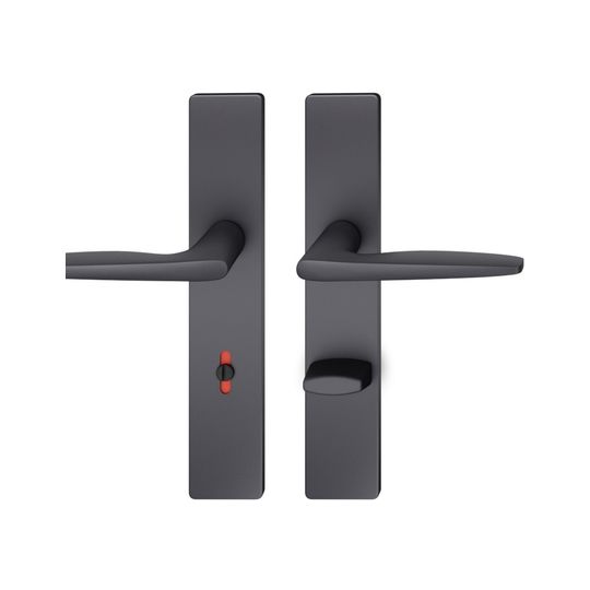 FSB Drückergarnitur 12 1058; Produkttyp: Drückergarnitur; Produkttyp (Hersteller): Drückergarnitur; Ausführung: Langschild; Befestigungsart: verdeckt verschraubt; Befestigungstechnik: mit Stütznocken; Form: eckig; Vierkant: 8 mm; Material: Aluminium; Material Unterkonstruktion: Kunststoff-Edelstahl verstärkt; Form Türgriff (innen): Design; Form Türgriff (außen): Design; Länge Türgriff (innen): 128 mm; Länge Türgriff (außen): 128 mm; Höhe Türgriff (innen): 58 mm; Höhe Türgriff (außen): 58 mm; Schildbreite außen: 45 mm; Schildbreite innen: 45 mm; Schildlänge außen: 245 mm; Schildlänge innen: 245 mm; Schildstärke außen: 7 mm; Schildstärke innen: 7 mm; Lagerung: Adapter-Standardlager,festdrehbar; Einsatzbereich: Zimmertür; Türart: Vollblatt; Türwerkstoff: Holz,Stahl; Norm: DIN EN 1906; Lochung: WC Schauscheibe/Schlitzkopf; Entfernung: 78 mm; Riegel-Vierkant: 8 mm; DIN-Richtung: DIN Links-Rechts; Farbe: schwarz; Oberfläche: gestrahlt,eloxiert; Design Türdrücker: Johannes Potente; Ausführung Vierkant: Stabilstift; Betätigungswinkel max.: 45 °; Türstärke min.: 39 mm; Türstärke max.: 58 mm