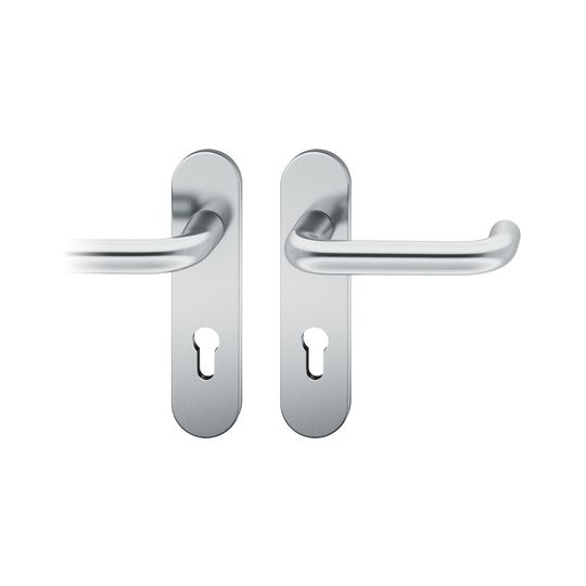 FSB Drückergarnitur 12 1070; Produkttyp: Drückergarnitur; Produkttyp (Hersteller): Drückergarnitur; Ausführung: Kurzschild; Befestigungsart: verdeckt verschraubt; Befestigungstechnik: mit Stütznocken; Form: oval; Vierkant: 8 mm; Material: Edelstahl; Material Unterkonstruktion: Kunststoff; Form Türgriff (innen): U-Form; Form Türgriff (außen): U-Form; Durchmesser Türgriff (innen): 20 mm; Durchmesser Türgriff (außen): 20 mm; Länge Türgriff (innen): 145 mm; Länge Türgriff (außen): 145 mm; Höhe Türgriff (innen): 63 mm; Höhe Türgriff (außen): 63 mm; Schildbreite außen: 45 mm; Schildbreite innen: 45 mm; Schildlänge außen: 185 mm; Schildlänge innen: 185 mm; Schildstärke außen: 7 mm; Schildstärke innen: 7 mm; Lagerung: Adapter-Standardlager,festdrehbar; Einsatzbereich: Zimmertür; Türart: Vollblatt; Türwerkstoff: Holz,Stahl; Norm: DIN EN 1906; Lochung: Profilzylinder gelocht; Entfernung: 72 mm; DIN-Richtung: DIN Links-Rechts; Farbe: grau; Farbton: edelstahl; Oberfläche: poliert; Ausführung Vierkant: Stabilstift; Betätigungswinkel max.: 45 °; Türstärke min.: 39 mm; Türstärke max.: 58 mm