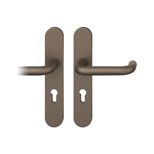 FSB Drückergarnitur 12 1070; Produkttyp: Drückergarnitur; Produkttyp (Hersteller): Drückergarnitur; Ausführung: Langschild; Befestigungsart: verdeckt verschraubt; Befestigungstechnik: mit Stütznocken; Form: oval; Vierkant: 8 mm; Material: Aluminium; Material Unterkonstruktion: Kunststoff-Edelstahl verstärkt; Form Türgriff (innen): U-Form; Form Türgriff (außen): U-Form; Durchmesser Türgriff (innen): 20 mm; Durchmesser Türgriff (außen): 20 mm; Länge Türgriff (innen): 145 mm; Länge Türgriff (außen): 145 mm; Höhe Türgriff (innen): 63 mm; Höhe Türgriff (außen): 63 mm; Schildbreite außen: 45 mm; Schildbreite innen: 45 mm; Schildlänge außen: 245 mm; Schildlänge innen: 245 mm; Schildstärke außen: 7 mm; Schildstärke innen: 7 mm; Lagerung: Adapter-Standardlager,festdrehbar; Einsatzbereich: Zimmertür; Türart: Vollblatt; Türwerkstoff: Holz,Stahl; Norm: DIN EN 1906; Lochung: Profilzylinder gelocht; Entfernung: 72 mm; DIN-Richtung: DIN Links-Rechts; Farbe: braun; Farbton: mittelbronzefarbig; Oberfläche: gestrahlt,eloxiert; Ausführung Vierkant: Stabilstift; Betätigungswinkel max.: 45 °; Türstärke min.: 39 mm; Türstärke max.: 58 mm