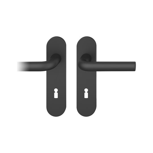 FSB Drückergarnitur 12 1075; Produkttyp: Drückergarnitur; Produkttyp (Hersteller): Drückergarnitur; Ausführung: Kurzschild; Befestigungsart: verdeckt verschraubt; Befestigungstechnik: mit Stütznocken; Form: oval; Vierkant: 8 mm; Material: Aluminium; Material Unterkonstruktion: Kunststoff; Form Türgriff (innen): gebogen; Form Türgriff (außen): gebogen; Durchmesser Türgriff (innen): 20 mm; Durchmesser Türgriff (außen): 20 mm; Länge Türgriff (innen): 132 mm; Länge Türgriff (außen): 132 mm; Höhe Türgriff (innen): 63 mm; Höhe Türgriff (außen): 63 mm; Schildbreite außen: 45 mm; Schildbreite innen: 45 mm; Schildlänge außen: 185 mm; Schildlänge innen: 185 mm; Schildstärke außen: 7 mm; Schildstärke innen: 7 mm; Lagerung: Adapter-Standardlager,festdrehbar; Einsatzbereich: Zimmertür; Türart: Vollblatt; Türwerkstoff: Holz,Stahl; Norm: DIN EN 1906; Lochung: Buntbart gelocht; Entfernung: 72 mm; DIN-Richtung: DIN Links-Rechts; Farbe: schwarz; Oberfläche: gestrahlt,eloxiert; Ausführung Vierkant: Stabilstift; Betätigungswinkel max.: 45 °; Türstärke min.: 39 mm; Türstärke max.: 58 mm