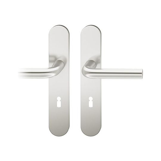 FSB Drückergarnitur 12 1075; Produkttyp: Drückergarnitur; Produkttyp (Hersteller): Drückergarnitur; Ausführung: Langschild; Befestigungsart: verdeckt verschraubt; Befestigungstechnik: mit Stütznocken; Form: oval; Vierkant: 8 mm; Material: Aluminium; Material Unterkonstruktion: Kunststoff-Edelstahl verstärkt; Form Türgriff (innen): gebogen; Form Türgriff (außen): gebogen; Durchmesser Türgriff (innen): 20 mm; Durchmesser Türgriff (außen): 20 mm; Länge Türgriff (innen): 132 mm; Länge Türgriff (außen): 132 mm; Höhe Türgriff (innen): 63 mm; Höhe Türgriff (außen): 63 mm; Schildbreite außen: 45 mm; Schildbreite innen: 45 mm; Schildlänge außen: 245 mm; Schildlänge innen: 245 mm; Schildstärke außen: 7 mm; Schildstärke innen: 7 mm; Lagerung: Adapter-Standardlager,festdrehbar; Einsatzbereich: Zimmertür; Türart: Vollblatt; Türwerkstoff: Holz,Stahl; Norm: DIN EN 1906; Lochung: ungelocht; DIN-Richtung: DIN Links-Rechts; Farbe: silber; Farbton: naturfarben; Oberfläche: eloxiert; Ausführung Vierkant: Stabilstift; Betätigungswinkel max.: 45 °; Türstärke min.: 39 mm; Türstärke max.: 58 mm