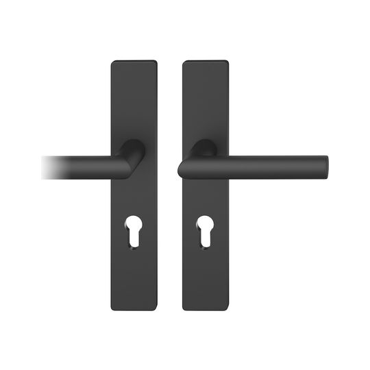 FSB Drückergarnitur 12 1076; Produkttyp: Drückergarnitur; Produkttyp (Hersteller): Drückergarnitur; Ausführung: Langschild; Befestigungsart: verdeckt verschraubt; Befestigungstechnik: mit Stütznocken; Form: eckig; Vierkant: 8 mm; Material: Aluminium; Material Unterkonstruktion: Kunststoff-Edelstahl verstärkt; Form Türgriff (innen): L-Form; Form Türgriff (außen): L-Form; Durchmesser Türgriff (innen): 21 mm; Durchmesser Türgriff (außen): 21 mm; Länge Türgriff (innen): 137 mm; Länge Türgriff (außen): 137 mm; Höhe Türgriff (innen): 58 mm; Höhe Türgriff (außen): 58 mm; Schildbreite außen: 45 mm; Schildbreite innen: 45 mm; Schildlänge außen: 245 mm; Schildlänge innen: 245 mm; Schildstärke außen: 7 mm; Schildstärke innen: 7 mm; Lagerung: Adapter-Standardlager,festdrehbar; Einsatzbereich: Zimmertür; Türart: Vollblatt; Türwerkstoff: Holz,Stahl; Norm: DIN EN 1906; Lochung: Profilzylinder gelocht; Entfernung: 72 mm; DIN-Richtung: DIN Links-Rechts; Farbe: schwarz; Oberfläche: gestrahlt,eloxiert; Ausführung Vierkant: Stabilstift; Betätigungswinkel max.: 45 °; Türstärke min.: 39 mm; Türstärke max.: 58 mm