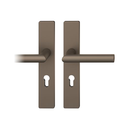 FSB Drückergarnitur 12 1076; Produkttyp: Drückergarnitur; Produkttyp (Hersteller): Drückergarnitur; Ausführung: Langschild; Befestigungsart: verdeckt verschraubt; Befestigungstechnik: mit Stütznocken; Form: eckig; Vierkant: 8 mm; Material: Aluminium; Material Unterkonstruktion: Kunststoff-Edelstahl verstärkt; Form Türgriff (innen): L-Form; Form Türgriff (außen): L-Form; Durchmesser Türgriff (innen): 21 mm; Durchmesser Türgriff (außen): 21 mm; Länge Türgriff (innen): 137 mm; Länge Türgriff (außen): 137 mm; Höhe Türgriff (innen): 58 mm; Höhe Türgriff (außen): 58 mm; Schildbreite außen: 45 mm; Schildbreite innen: 45 mm; Schildlänge außen: 245 mm; Schildlänge innen: 245 mm; Schildstärke außen: 7 mm; Schildstärke innen: 7 mm; Lagerung: Adapter-Standardlager,festdrehbar; Einsatzbereich: Haustür; Türart: Vollblatt; Türwerkstoff: Holz,Stahl; Norm: DIN EN 1906; Lochung: Profilzylinder gelocht; Entfernung: 92 mm; DIN-Richtung: DIN Links-Rechts; Farbe: braun; Farbton: mittelbronzefarbig; Oberfläche: gestrahlt,eloxiert; Ausführung Vierkant: Stabilstift; Betätigungswinkel max.: 45 °; Türstärke min.: 39 mm; Türstärke max.: 58 mm